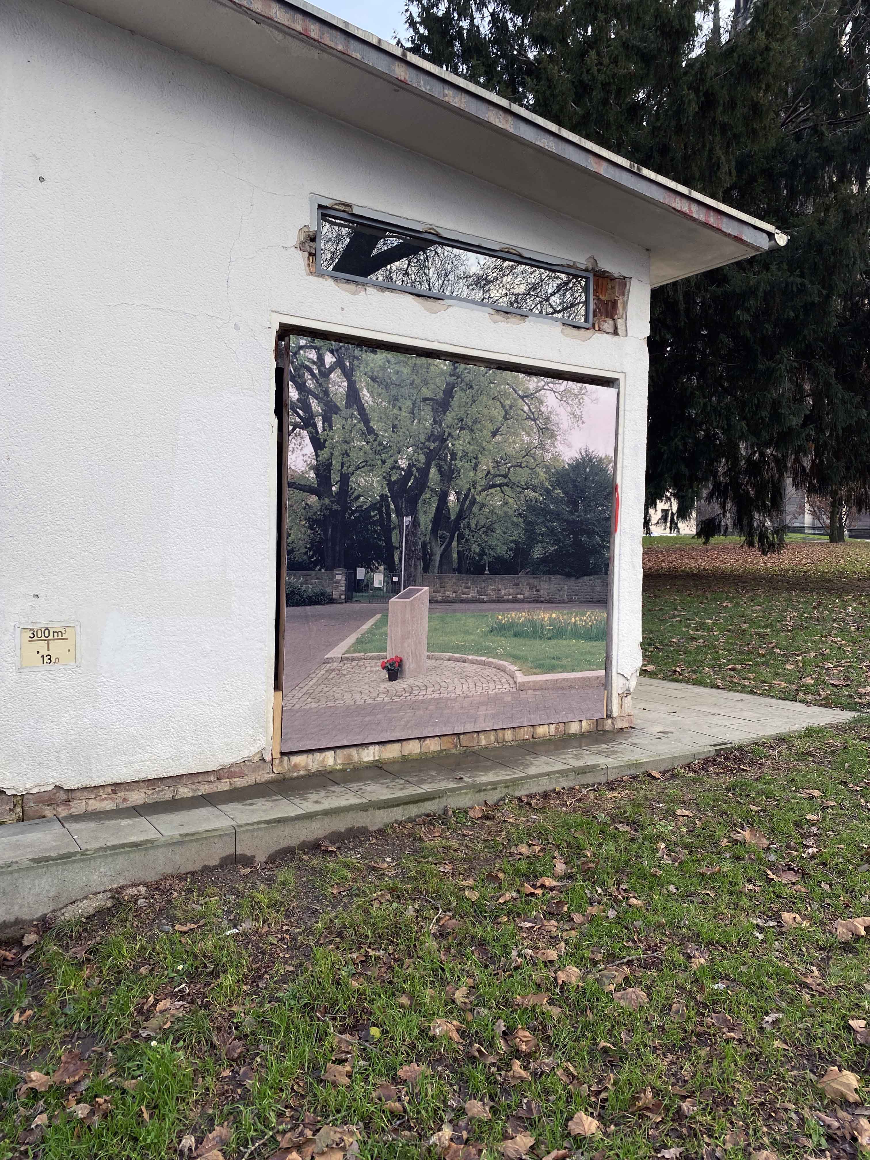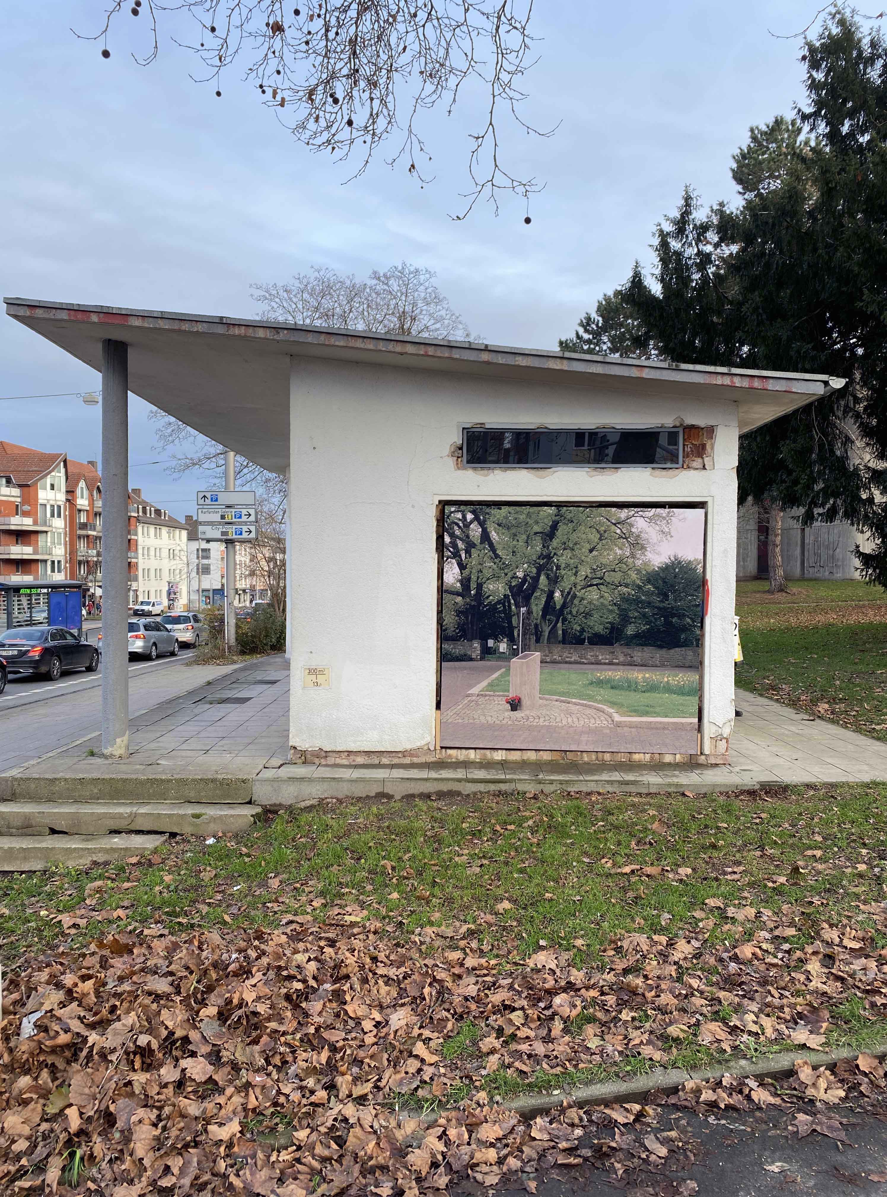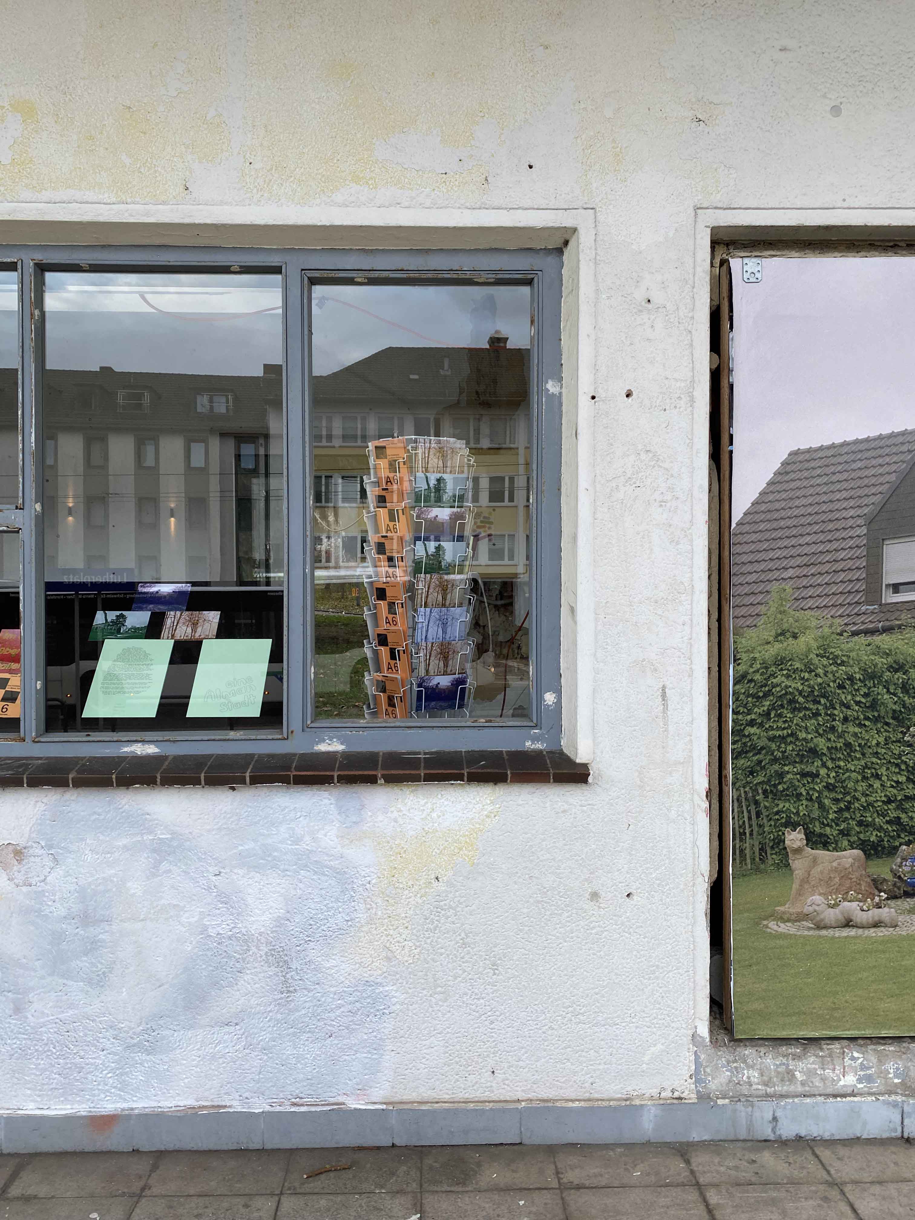 Eine Alman Stadt is an installation at Trafohaus Kassel (a publishing platform housed in an old electrical substation) realized based on the same-named book published in 2023. The installation consists of two billboards carrying photographs from the book in the front view; an Einfamilienhaus (typical German single-family house) with its front garden, and in the side view, Halitplatz with the memorial of Halit Yozgat—about 1 km far from the location of Trafohaus—who was murdered by the neo-Nazi group NSU in 2007.