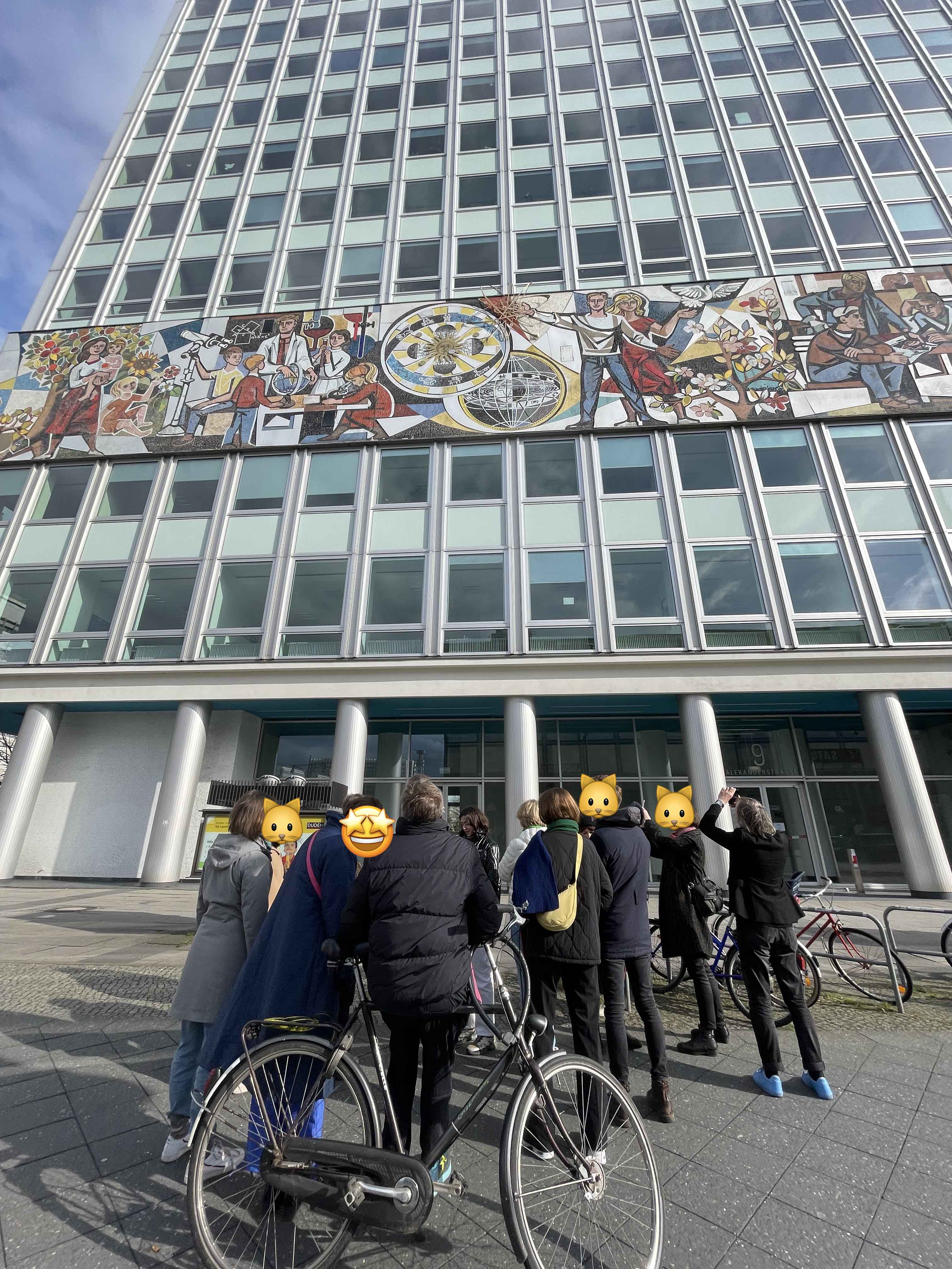 The exhibition Der Raum überwindet Zeit und Mensch (Space Overcomes Time and Man) takes its title from the copper relief Der Mensch überwindet Zeit und Raum (1971) by Walter Womacka on the southeast side of the Haus des Reisens (House of Travel), an 18-story GDR building situated in the immediate vicinity of Alexanderplatz. The twenty-four meter wide and five meter high relief is framed by planetary motives such as water, birds and tree branches. In the center are the three heads of a cosmonaut and two people, whose gazes and dynamic gestures point to the upper left corner of the picture, where a flaming sunmoon is depicted.
