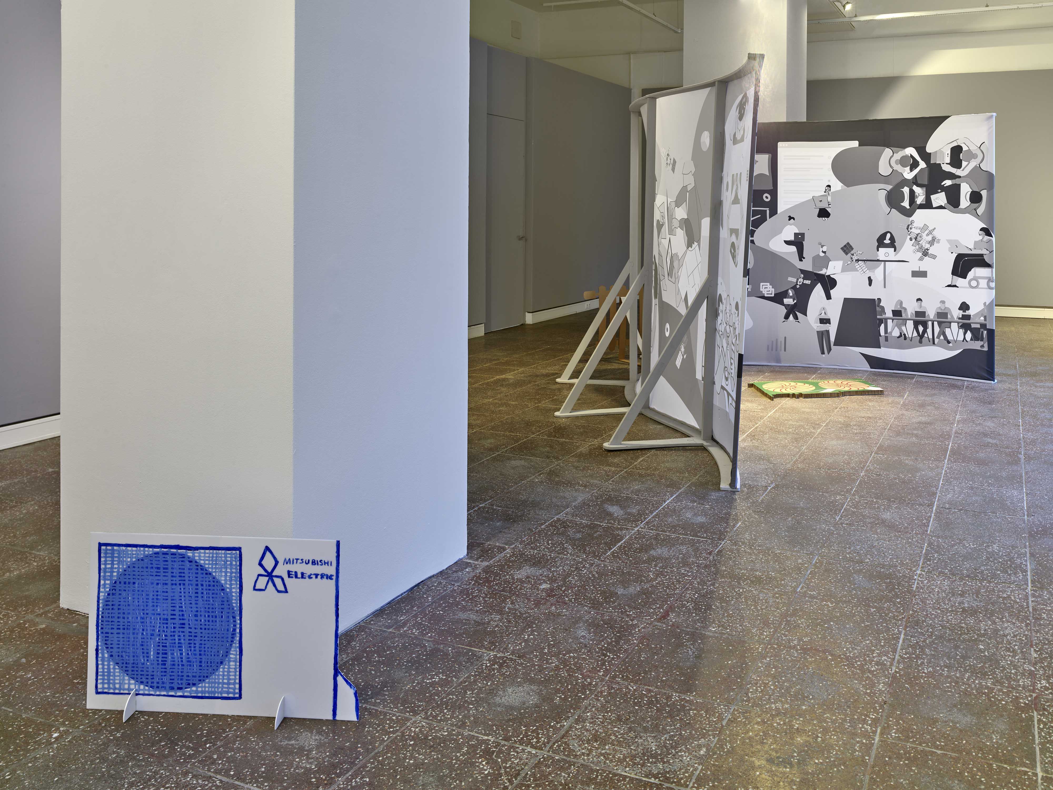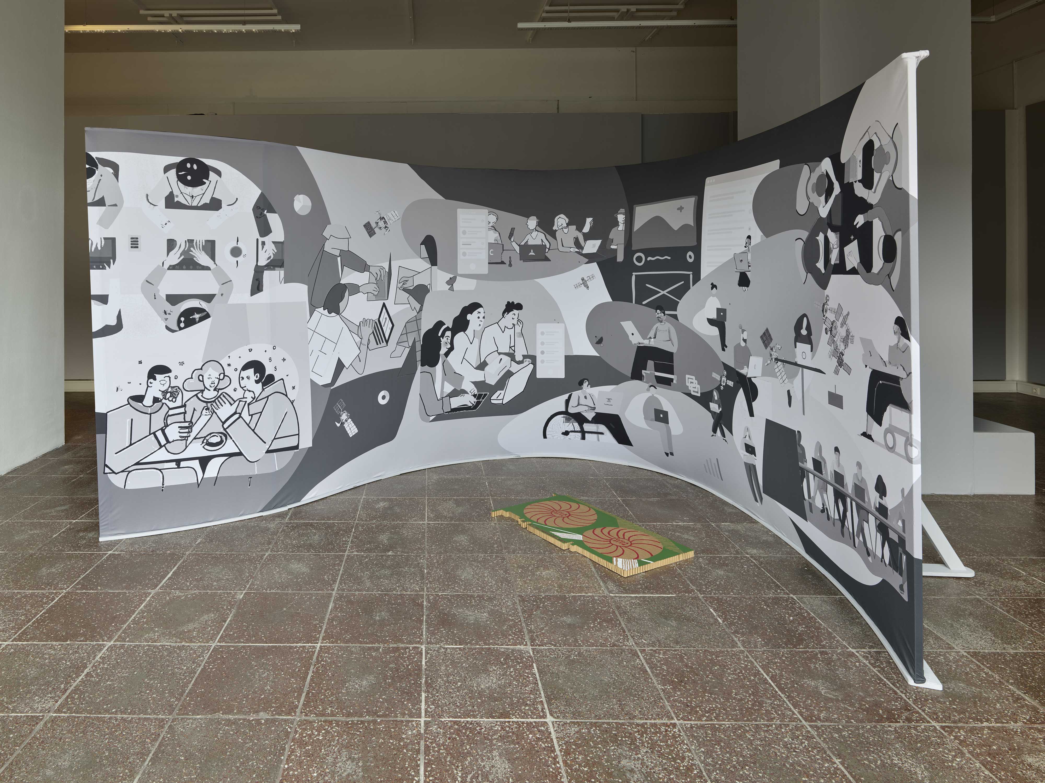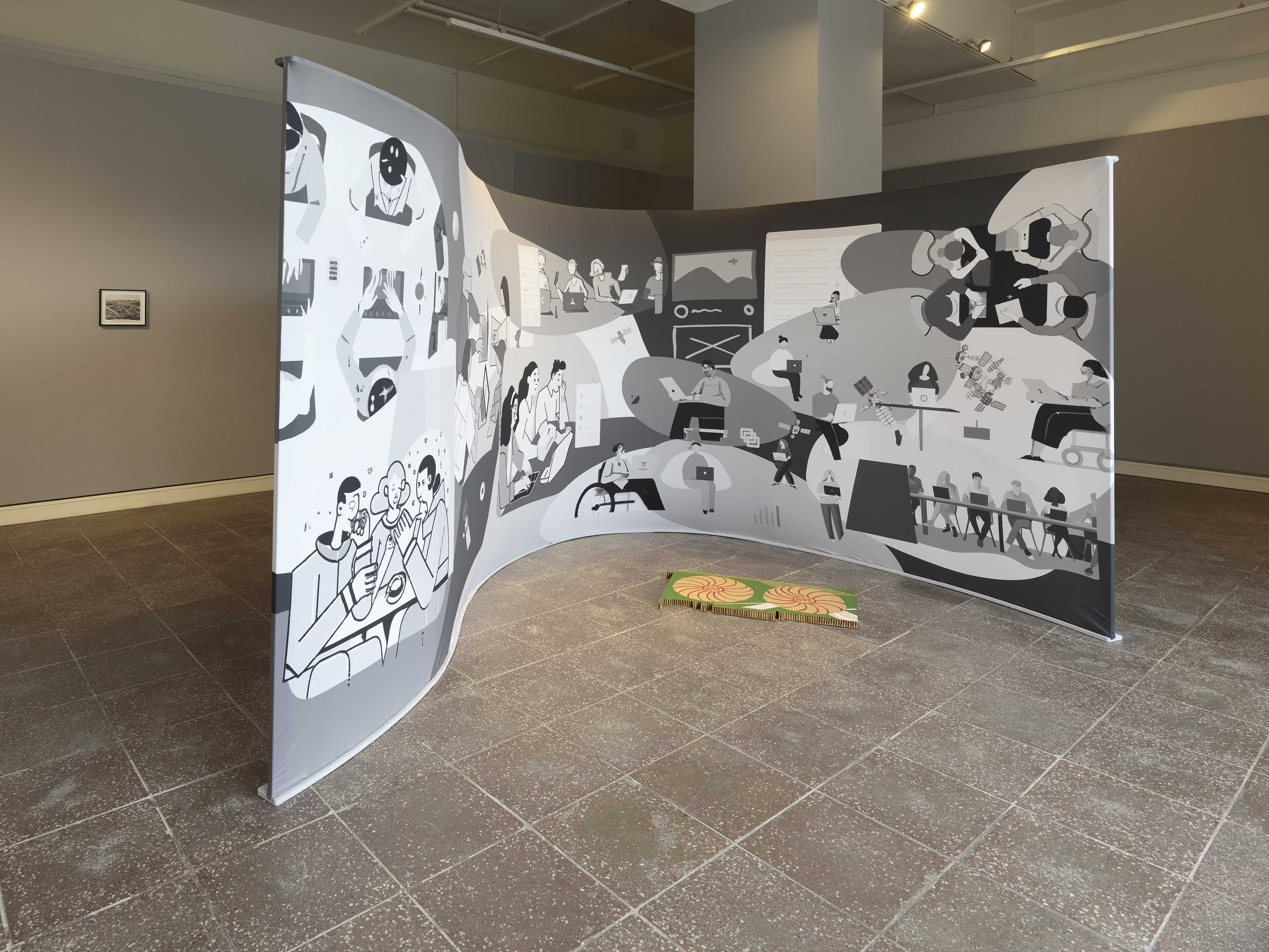 Based on the murals around Alexanderplatz, such as the one at the Haus des Reisens (House of Travel) or at the Haus des Lehrers (House of the Teacher), the artist Ipek Burçak examines in her work What if the externalities came to life (2023) how ideas of society, work, and community are visualized in the capitalist system. The (partition) wall piece, created for the exhibition, runs organically through the center of the gallery and shows various people (groups) in work situations on their laptops. Burçak generated this collage of images in the minimalist graphic style of "flat illustration" using open source AI. The visual language was originally developed for Facebook in 2017 and has since become ubiquitous in tech apps like Google and Adobe. In the multiplication and compilation of these generic images, the illusion of a work culture simultaneously characterized by diversity and collectivity becomes visible as such. The individualism sought in capitalism turns out to be uniformity.