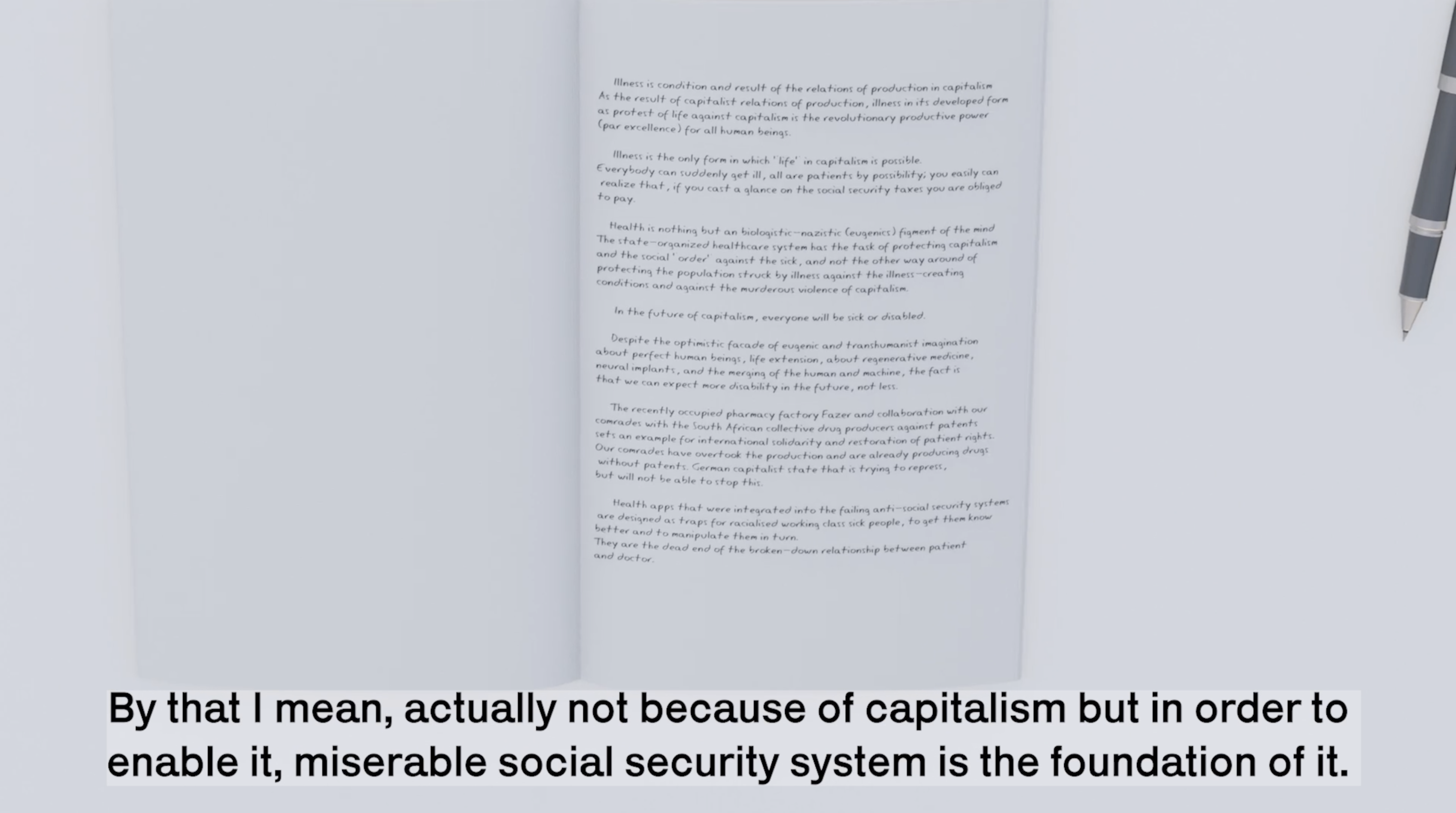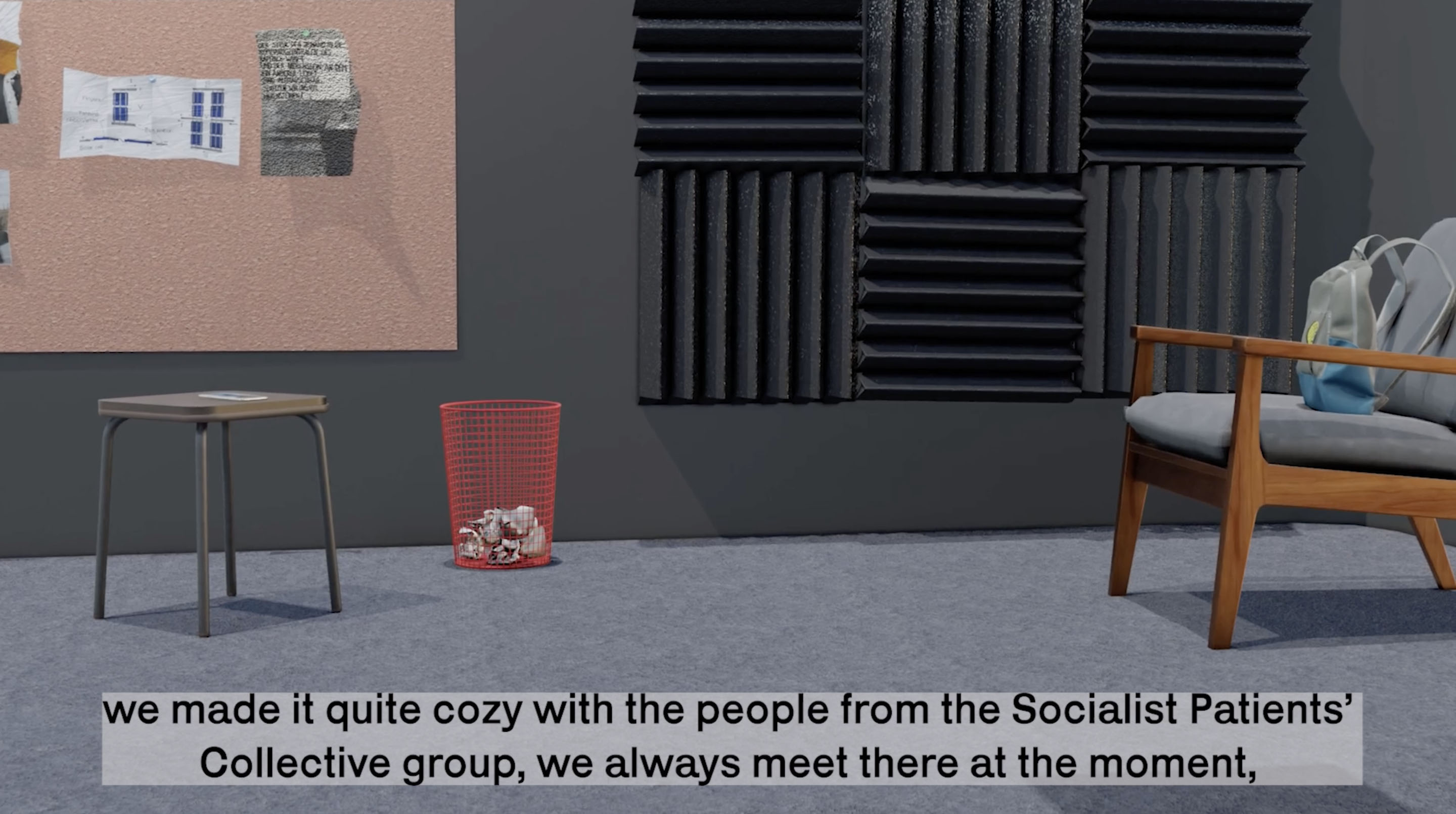 In Stochastic Datasets, the two podcasters are actively engaged in working through futures with non-capitalist technologies even though they live in a post- and hypercapitalist society in the near future. The podcast studio room works as a portal; there are remnants and artefacts (photos, objects) spread in the room that let the viewer dive into different aspects of the time and topics. In this alternative future, movements (like the Socialist Patients Collective) from the past have survived and continue to exist in connection with new struggles. How would a communist AI work? Can the health system be saved through or from AI?